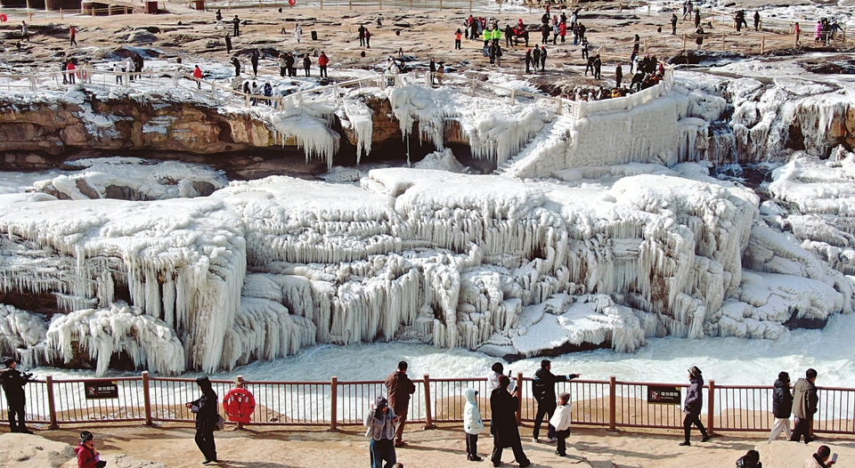 近日,受持續(xù)降溫天氣影響,黃河晉陜峽谷流凌密度持續(xù)增大,滾滾黃河水裹挾著大量流凌順流而下,在黃河壺口瀑布下游十里龍槽堆積凝結(jié),形成流凌封河景觀。圖為1月21日,眾多游客在吉縣黃河壺口瀑布景區(qū)打卡拍照。