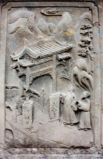 配坊實(shí)際上是一座功名石牌坊,上面刊載著武訪疇一家四代人的姓名及朝廷贈(zèng)封的官爵,咸豐六年(1856)由武訪疇修建。這座石雕牌坊與其它牌坊最大的區(qū)別就是沒有題刻坊名,因此只能稱之為配坊。坐北向南,為四柱三間三樓單檐歇山頂結(jié)構(gòu),牌樓高8米,寬12米,坊體坐落在近1米高的長方形臺基上,立柱仍然采用夾柱石固定。坊頂覆蓋青瓦,正脊飾石雕貔貅裝飾,飛檐翹角,明樓檐下為“圣旨”牌,當(dāng)心間設(shè)兩層小字板,第一層題刻:“贈(zèng)資政大夫曾祖父廷桂,贈(zèng)夫人曾祖母李氏;誥贈(zèng)資政大夫祖父秉壁,誥贈(zèng)夫人祖母吳氏;誥贈(zèng)資政大夫父烈,誥封夫人母朱氏。陜西分巡延榆綏兵備道、加四級武訪疇謹(jǐn)建?!钡诙宇}刻“大清咸豐六年歲次丙辰仲夏上院榖旦”。武訪疇借建坊要弘揚(yáng)祖輩陰德,而祖輩的姓氏大名又不能題刻在母親的節(jié)孝牌坊上,所以,他必須另建一坊才能完整地表達(dá)心愿。實(shí)際上,這就是建造配坊的真正目的。也正因此在配坊題刻“龍光錫寵”、“鳳詔褒榮”、“克成先志”、“重裕后昆”等。