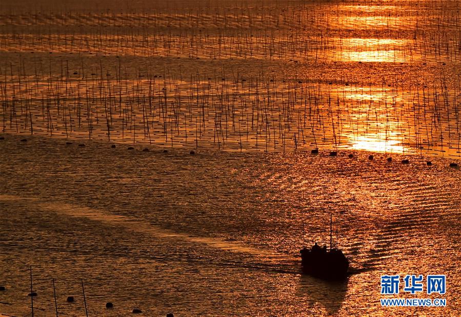 12月9日,夕陽(yáng)西下,一艘漁船穿行在海上紫菜養(yǎng)殖架間。福建省寧德市的霞浦縣以美麗的淺海、灘涂聞名,豐富的旅游資源和人文資源一直是攝影師追逐的靈感所在。 新華社記者魏培全攝