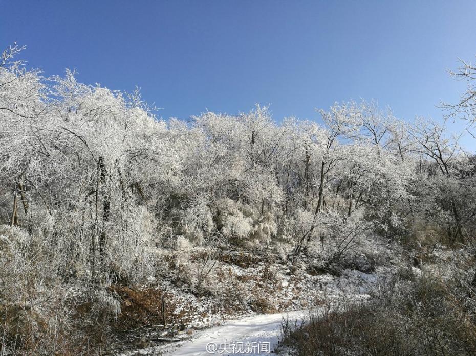 受較強冷空氣影響,秦嶺腹地涼風(fēng)埡山頂,出現(xiàn)大面積霧凇景觀。玉樹瓊枝,晶瑩剔透,讓涼風(fēng)埡山頂變得像童話世界一般,美不勝收。 央視記者王志杰 圖片來源:央視新聞微博