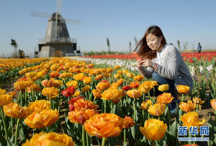 4月19日,游客在衡水湖森林公園欣賞郁金香。近日,河北衡水市冀州區(qū)衡水湖森林公園的48個品種、近百萬株郁金香競相開放,吸引游客前來觀賞游玩。(新華社記者 王曉 攝)