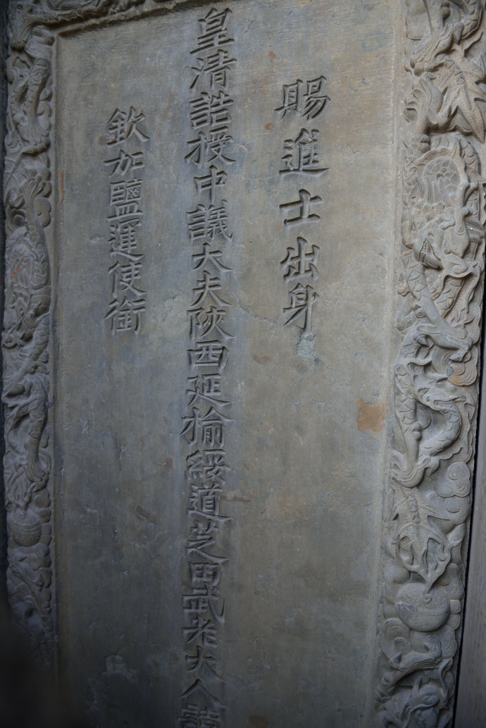配坊實際上是一座功名石牌坊,上面刊載著武訪疇一家四代人的姓名及朝廷贈封的官爵,咸豐六年(1856)由武訪疇修建。這座石雕牌坊與其它牌坊最大的區(qū)別就是沒有題刻坊名,因此只能稱之為配坊。坐北向南,為四柱三間三樓單檐歇山頂結構,牌樓高8米,寬12米,坊體坐落在近1米高的長方形臺基上,立柱仍然采用夾柱石固定。坊頂覆蓋青瓦,正脊飾石雕貔貅裝飾,飛檐翹角,明樓檐下為“圣旨”牌,當心間設兩層小字板,第一層題刻:“贈資政大夫曾祖父廷桂,贈夫人曾祖母李氏;誥贈資政大夫祖父秉壁,誥贈夫人祖母吳氏;誥贈資政大夫父烈,誥封夫人母朱氏。陜西分巡延榆綏兵備道、加四級武訪疇謹建?!钡诙宇}刻“大清咸豐六年歲次丙辰仲夏上院榖旦”。武訪疇借建坊要弘揚祖輩陰德,而祖輩的姓氏大名又不能題刻在母親的節(jié)孝牌坊上,所以,他必須另建一坊才能完整地表達心愿。實際上,這就是建造配坊的真正目的。也正因此在配坊題刻“龍光錫寵”、“鳳詔褒榮”、“克成先志”、“重裕后昆”等。