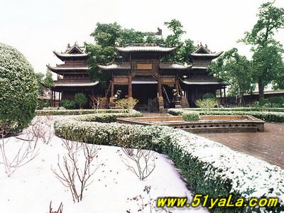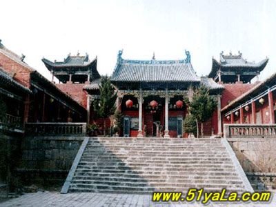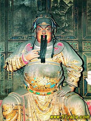 前行有午門.是一座面闊五間,單檐廡殿頂、石雕回廊的廳式建筑。周圍有石欄桿,欄板正反兩面浮雕各類圖案、人物144幅,洋洋大觀,頗有童趣。廳內(nèi)南有周倉、廖化畫像,軒昂威武。北面左右兩側(cè),彩繪著關(guān)羽戎馬一生的主要經(jīng)歷,起于桃園三結(jié)義,止于水淹七軍,只是沒有走麥城這個(gè)情節(jié),在全國關(guān)廟壁畫中都按此進(jìn)行,據(jù)說這是因忌諱關(guān)羽自高自大而被殺,終于造成蜀國的覆滅而隱去的。穿過午門,經(jīng)“山海鐘靈”坊、御書樓,便是關(guān)帝廟主體建筑崇寧殿。