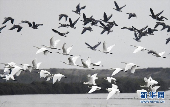 11月29日,候鳥在江西鄱陽湖南磯濕地國家級(jí)自然保護(hù)區(qū)飛翔。近日,大批南遷候鳥飛抵鄱陽湖棲息越冬。