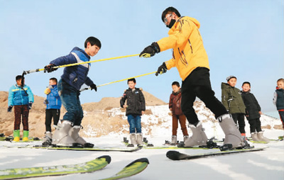 圖為在甘肅省山丹縣佛山滑雪場,近百名中小學(xué)生正在滑雪教練的指導(dǎo)下體驗(yàn)冰雪運(yùn)動樂趣。張 淵 攝(人民視覺)