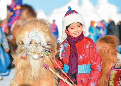 1月9日,內(nèi)蒙古蘇尼特右旗第12屆駱駝文化節(jié)在賽漢塔拉鎮(zhèn)舉行。來自鄂爾多斯、呼倫貝爾以及蘇尼特和烏珠穆沁草原的牧民帶著200多峰駱駝在白雪覆蓋的草原上進(jìn)行駱駝選美、駱駝競(jìng)速等比賽。文化節(jié)還舉行了賽馬、搏克等蒙古族傳統(tǒng)體育活動(dòng)。圖為一名蒙古族小朋友和駱駝合影。