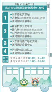 太原市將在山西文博會(huì)期間開(kāi)通5條免費(fèi)公交接駁專線。其中,4條市內(nèi)直達(dá)瀟河國(guó)際會(huì)展中心的專線,分別從九豐路公交總站—萬(wàn)象城(北向南新晉祠路長(zhǎng)興北街口公交站)—瀟河國(guó)際會(huì)展中心;勝利橋東公交總站—敦化坊(北向南建設(shè)北路敦化坊公交站)—山西大學(xué)(北向南塢城路山西大學(xué)公交站)—瀟河國(guó)際會(huì)展中心;火車南站西廣場(chǎng)公交站—瀟河國(guó)際會(huì)展中心;西橋地鐵站B站口—瀟河國(guó)際會(huì)展中心。運(yùn)行時(shí)間為市內(nèi)至瀟河方向8:00—15:00,瀟河至市內(nèi)方向10:00—18:00。此外,為便于駕車自行前往的市民出行,還開(kāi)通了1條社會(huì)停車場(chǎng)至山西瀟河國(guó)際會(huì)展中心的免費(fèi)接駁線路。該線路從先行路瀟河大街口經(jīng)先行路至?xí)怪行耐颠\(yùn)行,在智慧南街口、先行路樂(lè)商街口???,運(yùn)行時(shí)間為9:00—18:00。