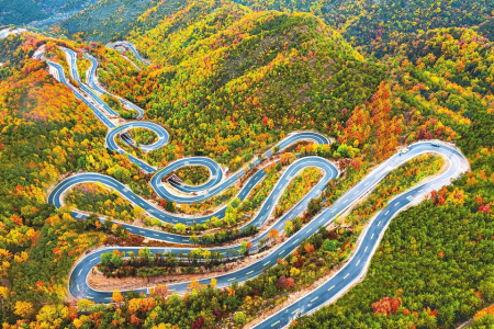 10月17日拍攝的左權(quán)縣太行龍泉風(fēng)景區(qū)景色。太行一號旅游公路北天池段,似長龍盤旋在五彩斑斕的太行秋色之中,峰回路轉(zhuǎn),風(fēng)景秀麗,繪成一幅絕美的天然畫卷,帶領(lǐng)游客開啟詩意之旅。
