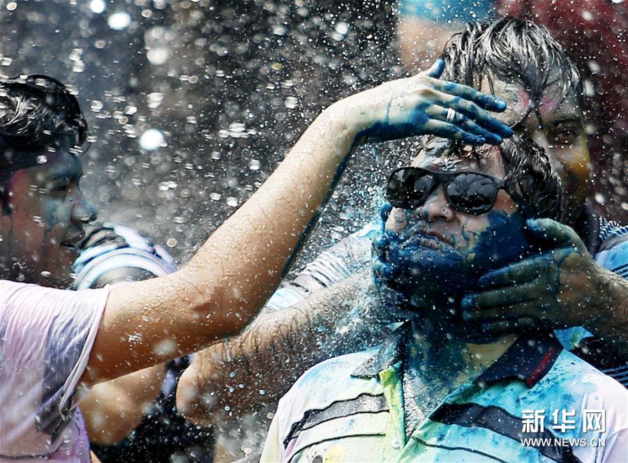 胡里節(jié)也叫“灑紅節(jié)”,人們?cè)谧约耗樕虾蜕砩贤可项伭希€向別人拋撒五顏六色的顏料和粉末,迎接春天的到來。新華社發(fā)(吳昂 攝)