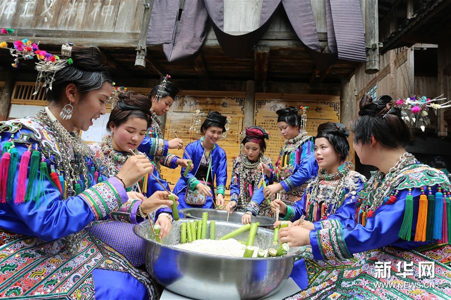 5月3日,貴州省首批魅力侗寨——榕江縣烏公侗寨歡度傳統(tǒng)的竹米節(jié),重溫侗民遠古農(nóng)耕風情。竹米節(jié)也叫吃竹筍飯,在每年谷雨至立夏期間竹筍生長的時候,侗族群眾采摘斑竹筍,把糯米灌進筍筒煮熟食用。這樣既能保持米飯的原味,又有竹筍的清香,并且還方便攜帶至坡上田間地頭食用。久而久之,侗族人每到春夏之交的農(nóng)耕時節(jié)都會過竹米節(jié),殺豬宰羊祭祀侗族祖先,唱歌跳舞祈求五谷豐登。新華社發(fā)(楊成利 攝)