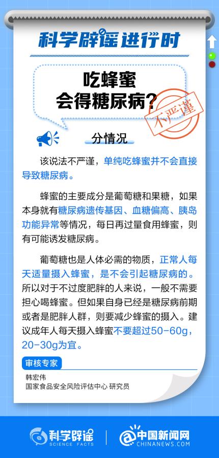 中新網(wǎng)8月11日電 單純吃蜂蜜并不會(huì)直接導(dǎo)致糖尿病。蜂蜜的主要成分是葡萄糖和果糖,如果本身就有糖尿病遺傳基因、血糖偏高、胰島功能異常等情況,每日再過(guò)量食用蜂蜜,則有可能誘發(fā)糖尿病。(來(lái)源:@科學(xué)辟謠 中國(guó)新聞網(wǎng)微博 )