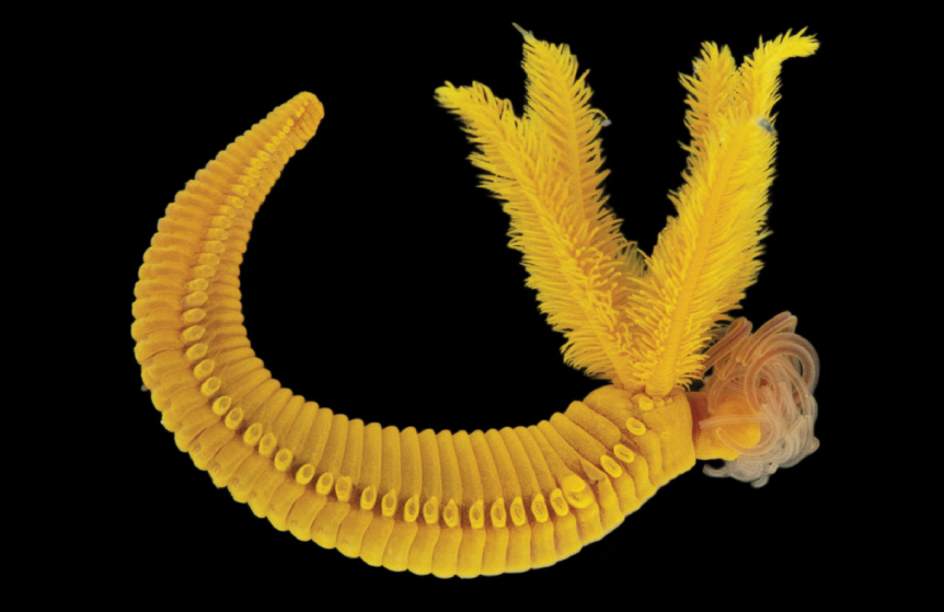 那么,為什么這種蠕蟲卻沒有被毒死?這得從它那身明亮的黃色說起。在深海的永恒黑暗中,大多數(shù)生物都是灰白色或深紅色,蠕蟲這身黃色便十分顯眼。