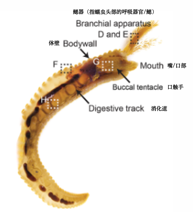 通過顯微鏡觀察,科學家發(fā)現(xiàn)蠕蟲的上皮細胞中充滿了直徑0.77-1.29微米的黃色顆粒。這些顆粒不僅存在于體表,還分布在鰓、口觸手和消化道中——所有與海水直接接觸的部位。