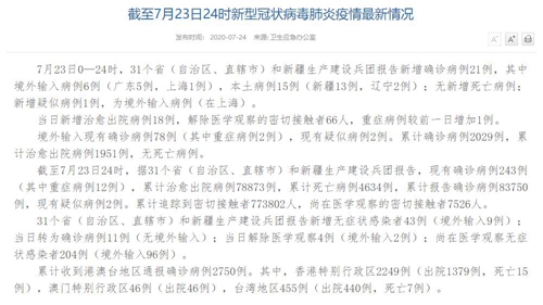 情況表示,截至7月23日24時,據(jù)31個省(自治區(qū)、直轄市)和新疆生產(chǎn)建設兵團報告,現(xiàn)有確診病例243例(其中重癥病例12例),累計治愈出院病例78873例,累計死亡病例4634例,累計報告確診病例83750例,現(xiàn)有疑似病例2例。累計追蹤到密切接觸者773802人,尚在醫(yī)學觀察的密切接觸者7526人。