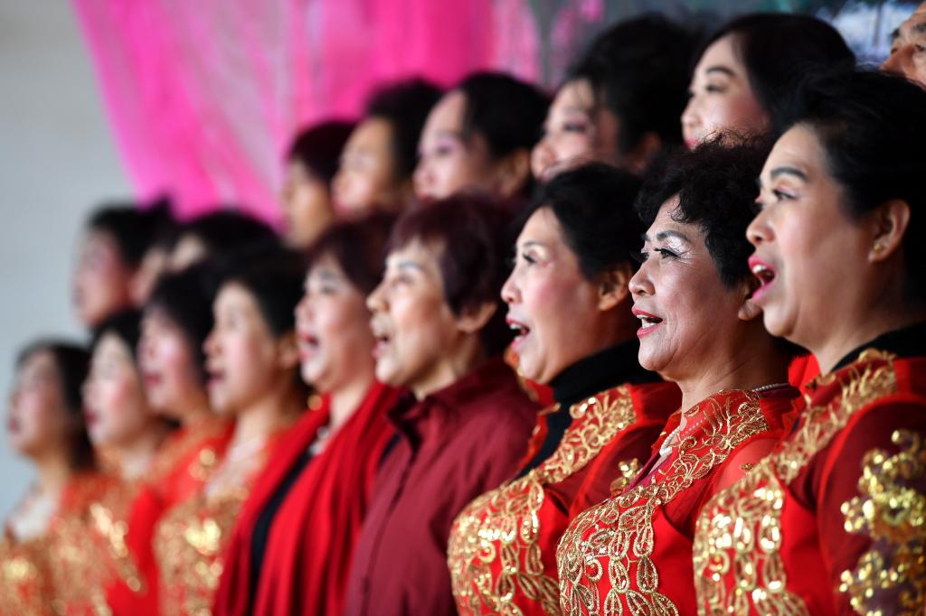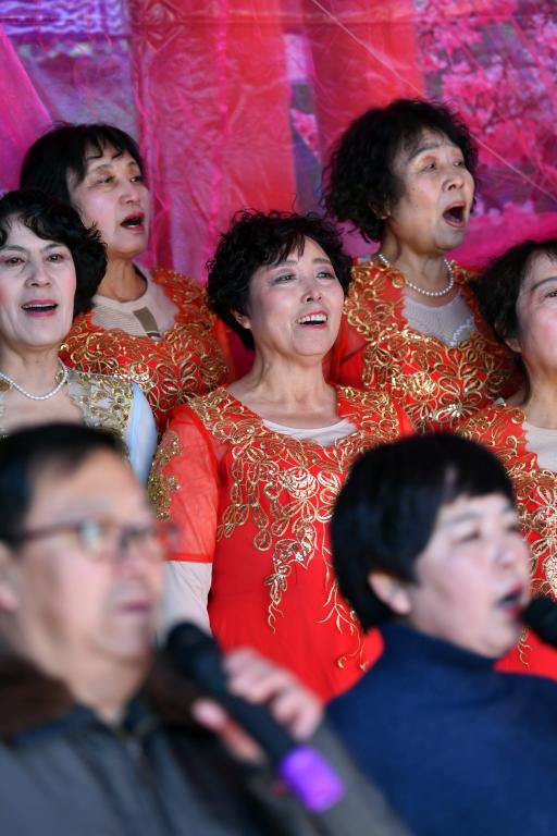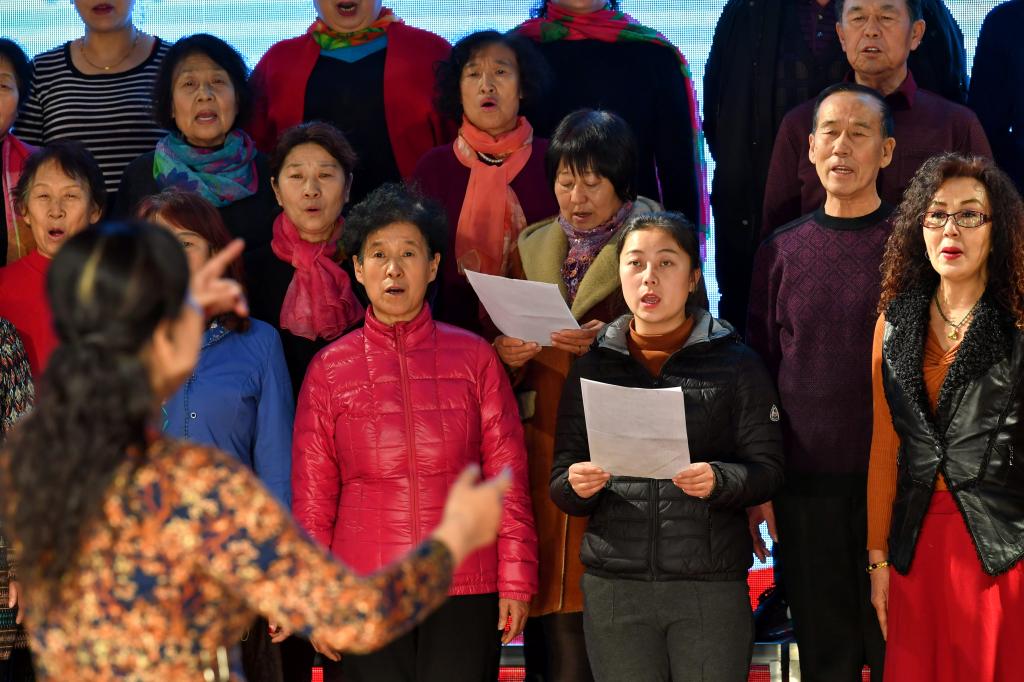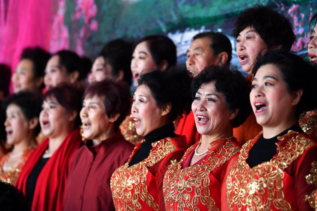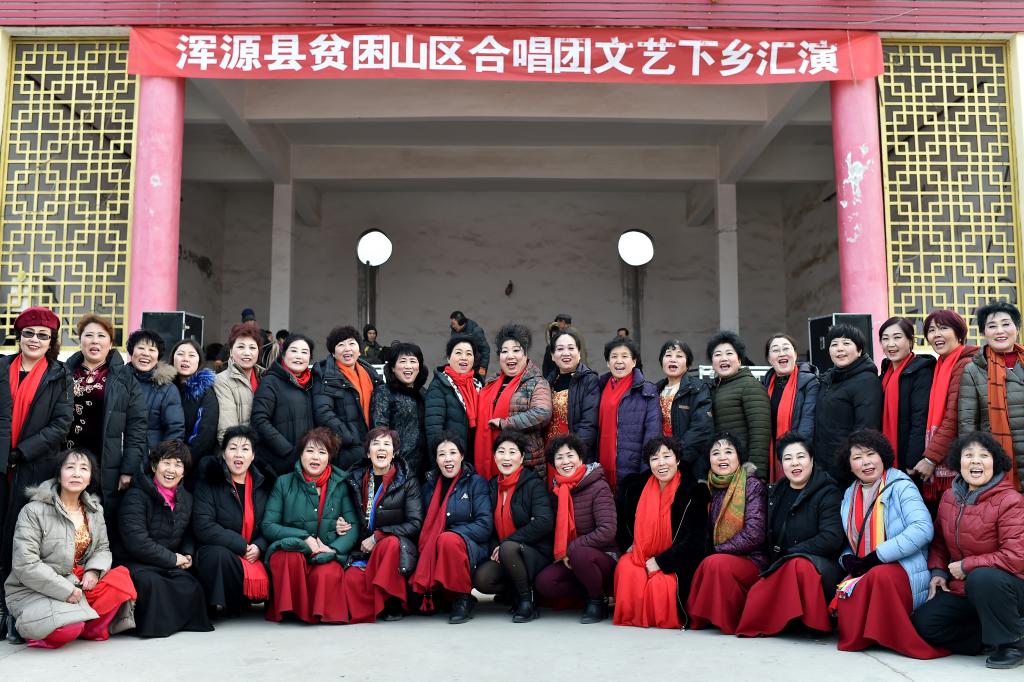 ↑1月3日,在山西省渾源縣荊莊村,渾源縣貧困山區(qū)合唱團在表演合唱《紅梅贊》。