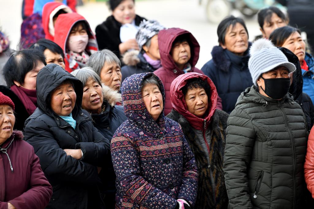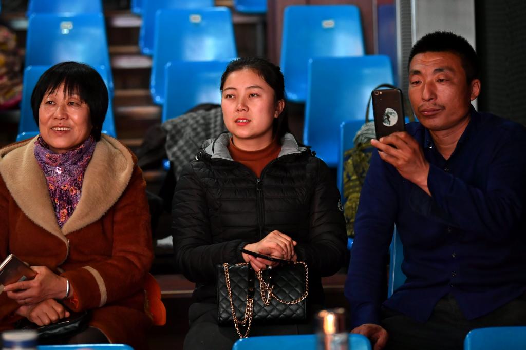 ↑1月3日,在山西省渾源縣荊莊村,村民們在欣賞渾源縣貧困山區(qū)合唱團的演出。