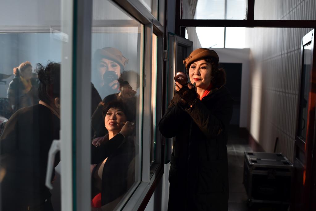 ↑1月3日,在山西省渾源縣貧困山區(qū)合唱團,一名團員在舞臺邊化妝。