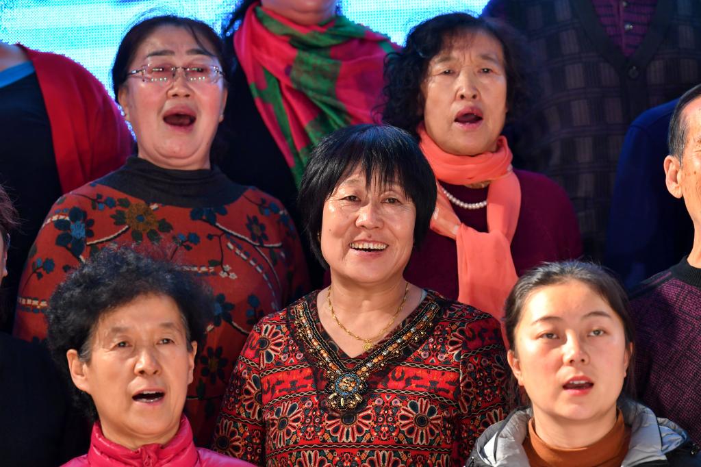 ↑1月3日,在山西省渾源縣荊莊村,渾源縣貧困山區(qū)合唱團在表演大合唱《祝福祖國》。