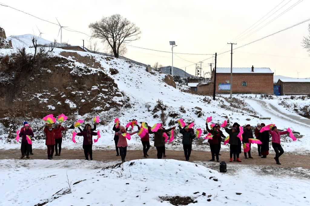 ↑1月2日,在山西省渾源縣山陰山村,村民在練習渾源縣貧困山區(qū)合唱團新教的秧歌。