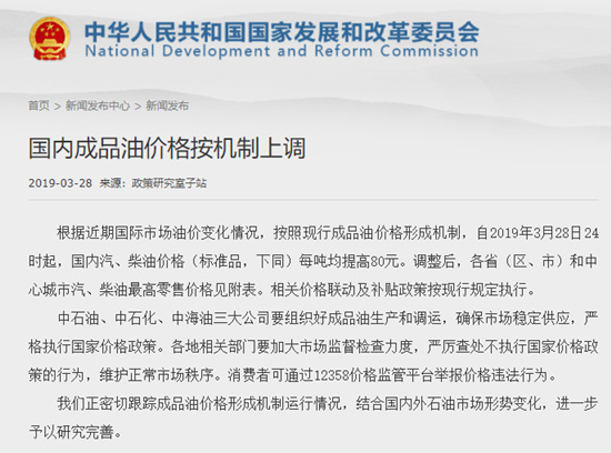 人民網(wǎng)北京3月28日電 (王紹紹) 國(guó)家發(fā)改委剛剛發(fā)布通知, 根據(jù)近期國(guó)際市場(chǎng)油價(jià)變化情況,按照現(xiàn)行成品油價(jià)格形成機(jī)制,自2019年3月28日24時(shí)起,國(guó)內(nèi)汽、柴油價(jià)格(標(biāo)準(zhǔn)品,下同)每噸均提高80元。調(diào)整后,各省(區(qū)、市)和中心城市汽、柴油最高零售價(jià)格見附表。相關(guān)價(jià)格聯(lián)動(dòng)及補(bǔ)貼政策按現(xiàn)行規(guī)定執(zhí)行。