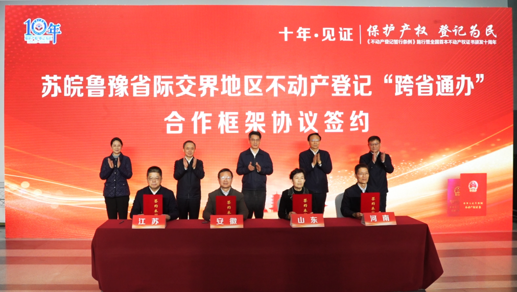 2025年3月1日,《不動產(chǎn)登記暫行條例》施行暨全國首本不動產(chǎn)權(quán)證書頒發(fā)十周年。在首證頒發(fā)地江蘇省徐州市舉辦的現(xiàn)場活動上,蘇皖魯豫省際交界地區(qū)合作再擴(kuò)容,四省十市正式簽訂框架協(xié)議,啟動不動產(chǎn)登記“跨省通辦”合作。