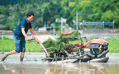 立夏過后,多地農(nóng)民搶抓農(nóng)時,陸續(xù)開展水稻插秧工作。圖為農(nóng)機手操作插秧機在貴州省黔西南布依族苗族自治州安龍縣春潭街道阿興村進(jìn)行插秧作業(yè)。據(jù)了解,當(dāng)?shù)亟陙硗ㄟ^建設(shè)高標(biāo)準(zhǔn)農(nóng)田,積極推廣多種農(nóng)用機械,不斷夯實糧食生產(chǎn)基礎(chǔ)。劉朝富攝(人民視覺)