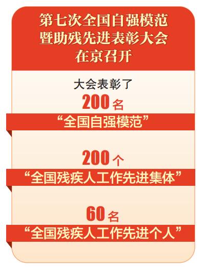 第七次全國(guó)自強(qiáng)模范暨助殘先進(jìn)表彰大會(huì)16日在北京人民大會(huì)堂召開。200名全國(guó)自強(qiáng)模范、200個(gè)全國(guó)殘疾人工作先進(jìn)集體和60名全國(guó)殘疾人工作先進(jìn)個(gè)人受到表彰。