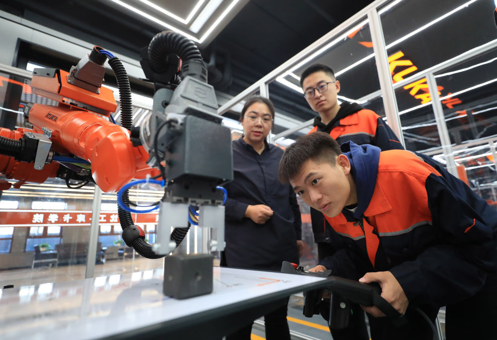 2024年11月22日,沈陽工學(xué)院電氣工程及自動化專業(yè)學(xué)生操作機器人進行物料碼垛實訓(xùn)。近年來,沈陽以產(chǎn)業(yè)需求為導(dǎo)向,促進技術(shù)院校與知名企業(yè)共建高水平新型工業(yè)化實踐教學(xué)中心,構(gòu)建校企協(xié)同合作推進產(chǎn)教深度融合,促進學(xué)生高質(zhì)量就業(yè)。新華社記者 楊青 攝
