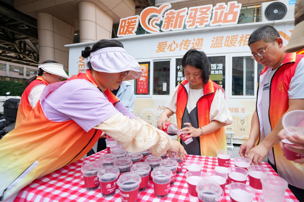 6月25日,在北京市東城區(qū)崇外街道一處“暖新驛站”外,街道工作人員在為高溫下的外賣員、快遞員準備冰鎮(zhèn)飲料。新華社記者 鞠煥宗 攝