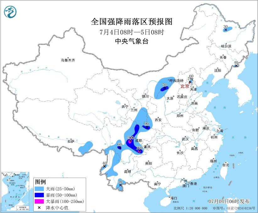 預(yù)計,7月4日8時至5日8時,內(nèi)蒙古河套地區(qū)、甘肅東部、寧夏南部、陜西北部和西南部、山西北部、四川盆地西部和南部、云南西部、西藏東部等地部分地區(qū)有大到暴雨,其中,四川盆地西部和南部等地局地有大暴雨(100~200毫米)。上述部分地區(qū)伴有短時強降水(最大小時降雨量20~50毫米,局地可超過70毫米),局地有雷暴大風(fēng)等強對流天氣。