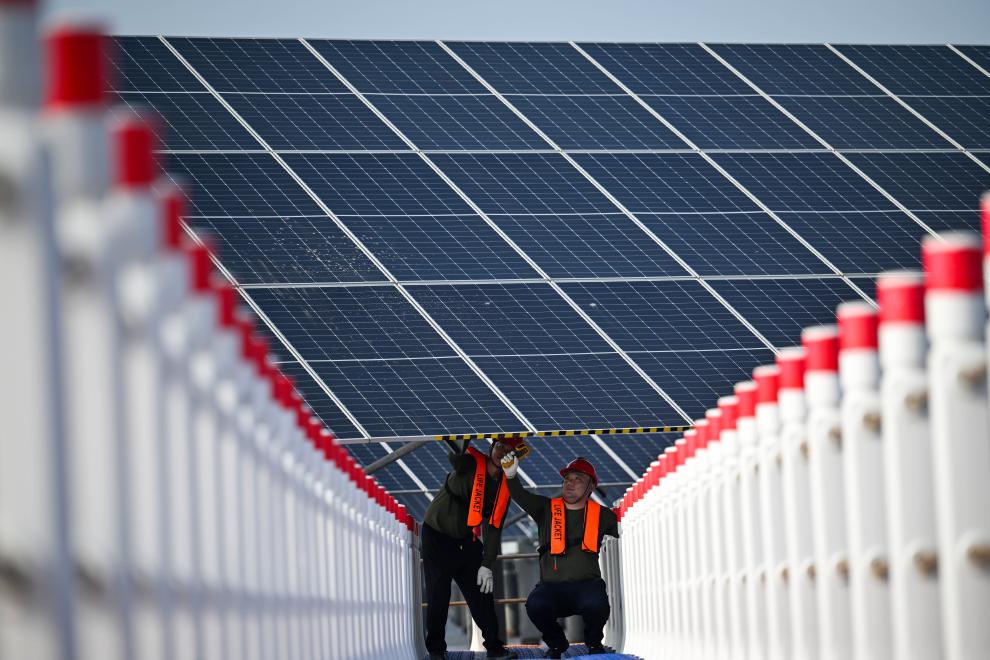 7月10日,在國(guó)家能源集團(tuán)天津龍?jiān)葱履茉从邢薰静郴夥娬?,工作人員在檢查光伏發(fā)電板。新華社記者趙子碩 攝