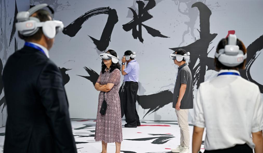 7月4日,2025上海合作組織國家電影節(jié)電影市場開幕式及電影科技成果展覽啟動活動在重慶永川國際會展中心舉行,嘉賓觀看中國電影科技企業(yè)的虛擬影片。新華社記者 陳誠 攝