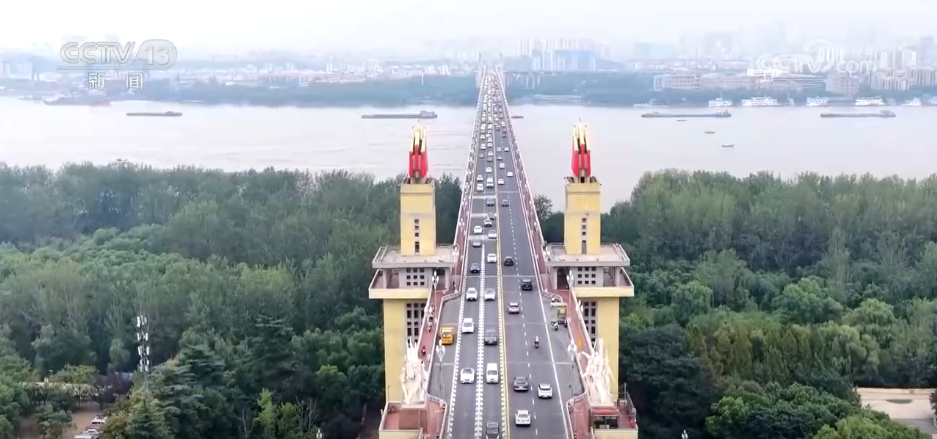 在江蘇南京,南京長(zhǎng)江大橋裝扮一新,喜迎國(guó)慶。公路橋橋頭堡周邊安排了花卉布展?;▔渣S色孔雀草為背景,明亮耀眼,搭配一串紅組成的紅色花卉飄帶,烘托出喜慶的節(jié)日氛圍。