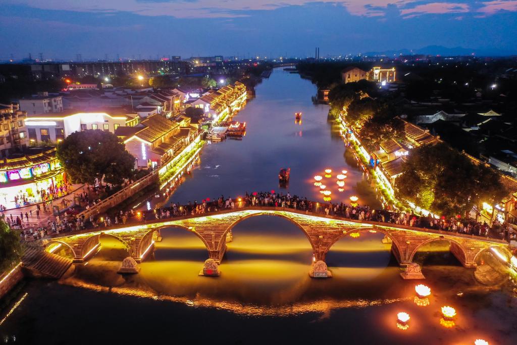 10月2日,游客在塘棲古鎮(zhèn)的廣濟(jì)橋觀賞運(yùn)河夜景(無人機(jī)照片)。新華社記者 徐昱 攝
