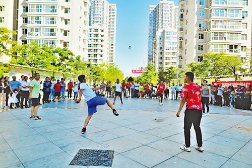 會后,來自全市各地的毽球愛好者展演了各自的絕活兒,小巧的毽球在表演者的腳尖上下翻飛,精彩迭出,高潮迭起,不斷博得觀眾的掌聲和叫好聲。(魯明強 攝影報道)