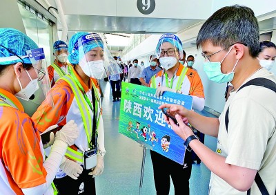 9月14日,在西安咸陽機(jī)場,工作人員為參加全運(yùn)會(huì)的記者提供服務(wù)。本報(bào)記者 郭紅松攝/光明圖片