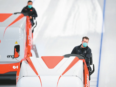 國家速滑館的中外工作人員在比賽間隙修整賽道。新華社記者 張晨霖 攝