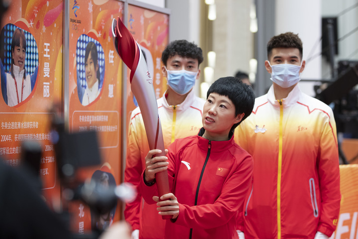 1月5日,北京冬奧會(huì)火炬開始在黑龍江省進(jìn)行展示,冬奧會(huì)短道速滑冠軍張會(huì)(中)在活動(dòng)現(xiàn)場手持火炬。新華社記者 張濤 攝
