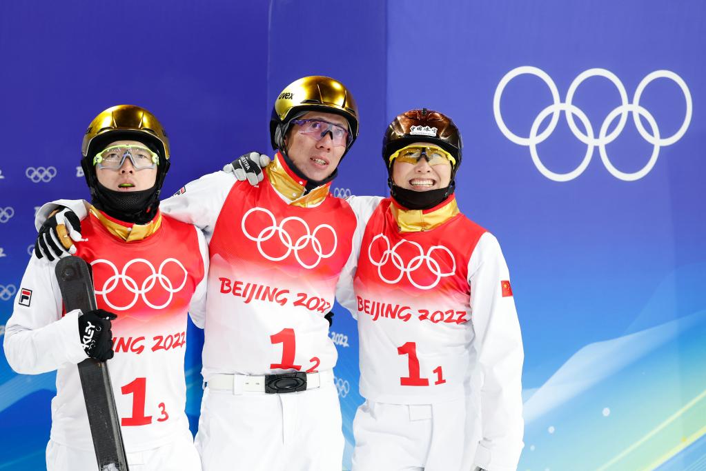 2月10日,中國隊(duì)選手賈宗洋(中)、徐夢(mèng)桃(右)和齊廣璞(左)在自由式滑雪空中技巧混合團(tuán)體比賽后等待成績公布。新華社記者費(fèi)茂華攝