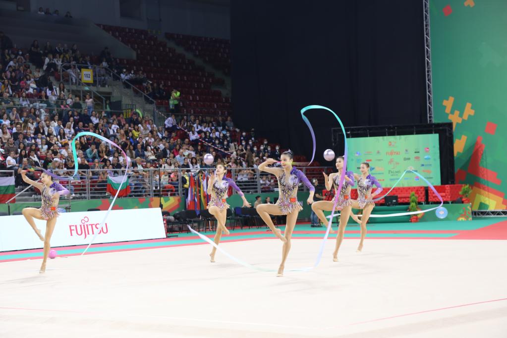 團(tuán)體5圈決賽中,意大利隊以34.950分獲得冠軍,以色列隊以34.050分排名第二,西班牙隊以33.800分獲季軍。中國隊在參賽的8支隊伍中排名第七。