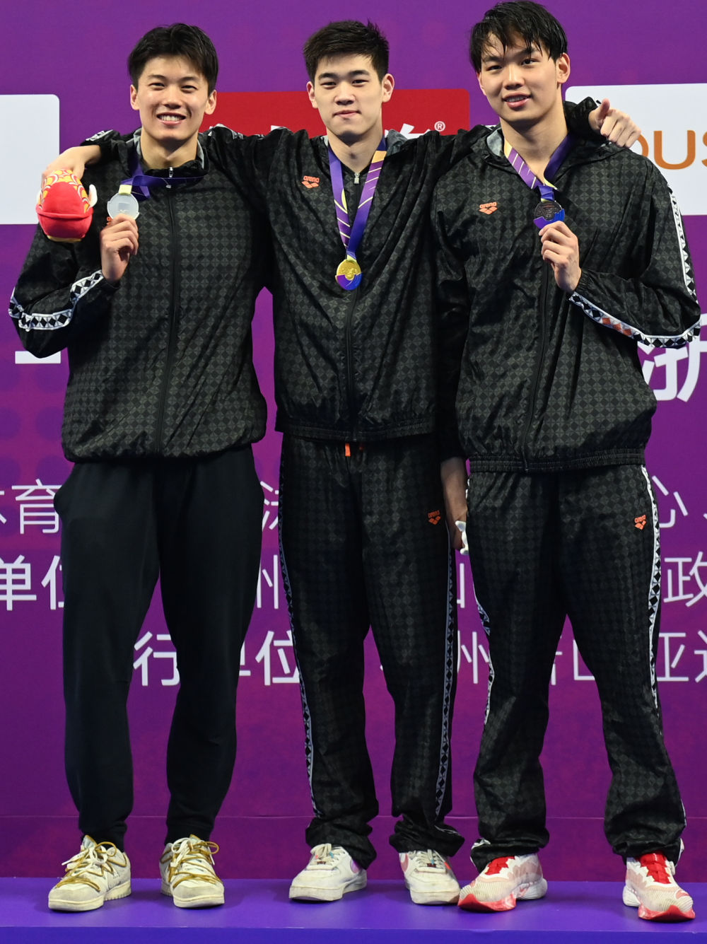 5月4日,分獲男子200米自由泳前三名的浙江隊選手潘展樂(中)、汪順(左)和洪金權(quán)在頒獎儀式上合影。新華社記者黃宗治攝