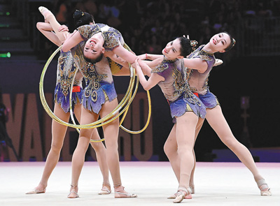 中國(guó)藝術(shù)體操隊(duì)的良好狀態(tài)延續(xù)到最后一個(gè)比賽日。在5圈單項(xiàng)決賽中,率先登場(chǎng)的中國(guó)隊(duì)高質(zhì)量地完成整套動(dòng)作,以36.550分獲得金牌,為中國(guó)藝術(shù)體操隊(duì)贏得首個(gè)世界冠軍。在隨后進(jìn)行的3帶2球單項(xiàng)決賽中,中國(guó)隊(duì)依舊發(fā)揮亮眼,以32.800分收獲一枚銀牌。