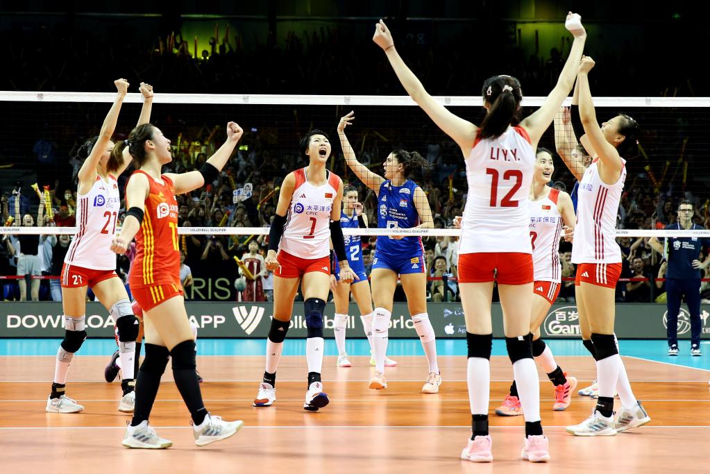 雙方在第三局開局戰(zhàn)至5:5后,中國隊(duì)打出了一波10:2的得分潮,并以25:14拿下第三局。
