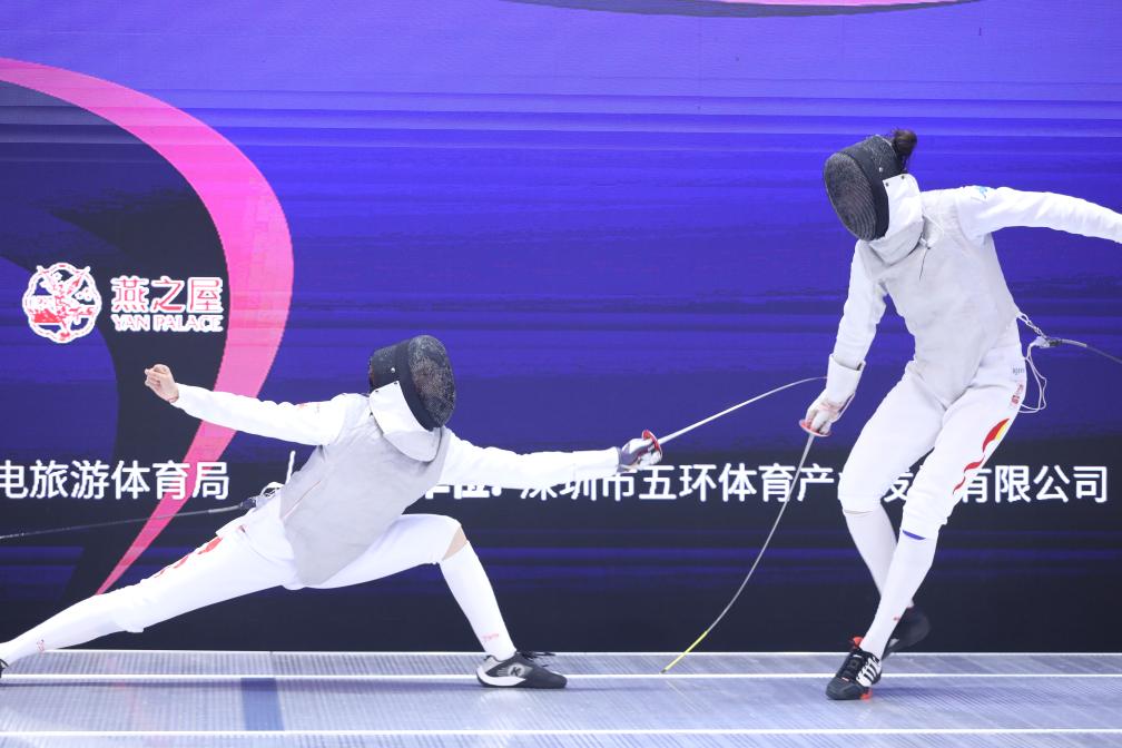 代銳(左)在男子佩劍個人決賽中對陣林霄