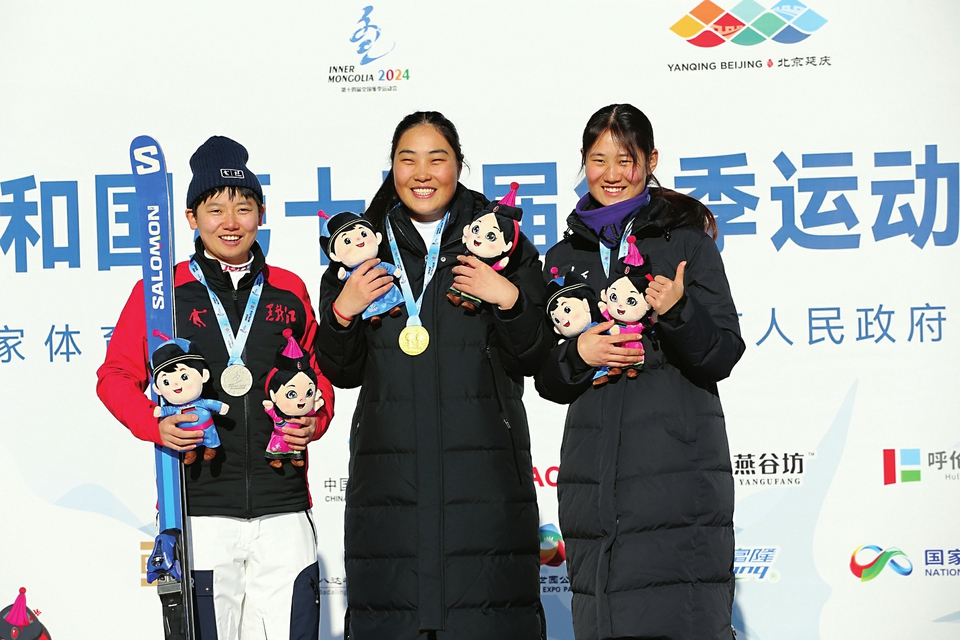 公開組女子滑降比賽頒獎(jiǎng)現(xiàn)場(chǎng),冠亞季軍合影。