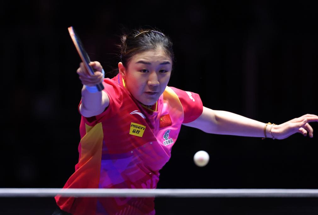 2月21日,中國隊(duì)球員陳夢(mèng)在第一盤比賽中回球。新華社記者 楊世堯 攝