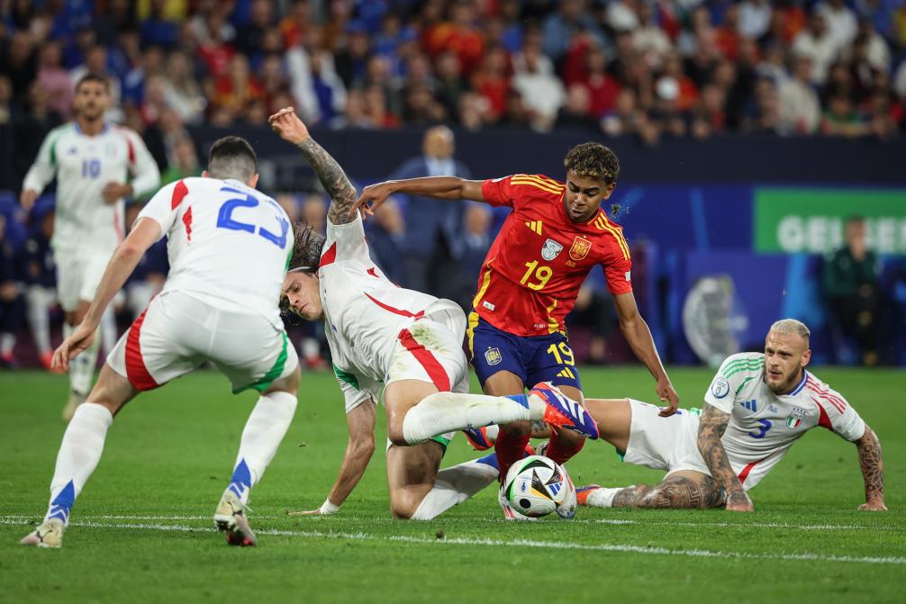 6月20日,西班牙隊(duì)球員亞馬爾(右二)在比賽中帶球突破。當(dāng)日,在德國蓋爾森基興進(jìn)行的2024歐洲足球錦標(biāo)賽B組次輪比賽中,西班牙隊(duì)1比0戰(zhàn)勝意大利隊(duì)。新華社記者 潘昱龍 攝 東道主德國隊(duì)在開局兩連勝后,讓人想起2006年世界杯闖入四強(qiáng)的那個沖擊力十足的“日耳曼戰(zhàn)車”。然而,與瑞士隊(duì)的最后一場小組賽,1:1的結(jié)果給不斷升溫的預(yù)期澆了一盆冷水。前場攻擊群受阻,中路滲透難以奏效,最后依靠正牌中鋒菲爾克魯格在補(bǔ)時階段的頭球破門,德國隊(duì)才避免主場失利。