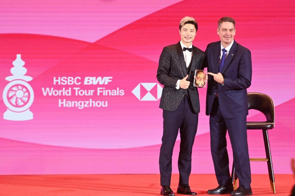 12月9日,世界羽聯主席拉爾森為獲得年度最佳男子單打運動員的中國選手石宇奇(左)頒獎。新華社記者 黃宗治 攝