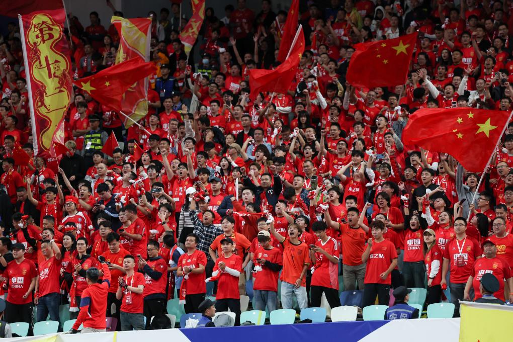 11月19日,球迷慶祝中國隊進球。當日,在福建廈門舉行的2026美加墨世界杯亞洲區(qū)預(yù)選賽18強賽第六輪比賽中,中國隊主場對陣日本隊。新華社記者 胡星宇 攝