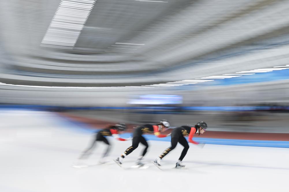 2024年12月15日,2024-2025賽季中國杯速度滑冰精英聯(lián)賽第四站暨亞冬會(huì)測(cè)試賽女子團(tuán)體追逐比賽在黑龍江省冰上訓(xùn)練中心舉行。新華社記者 張濤 攝